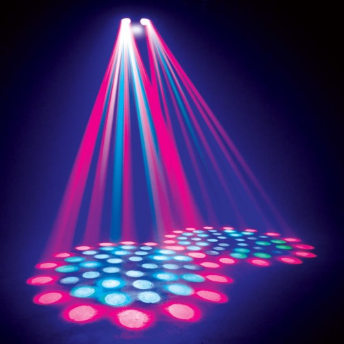 - LED dual mirrored Moonflower with sharp Red, Green & Blue high output colored beams + LED Strobe in one light